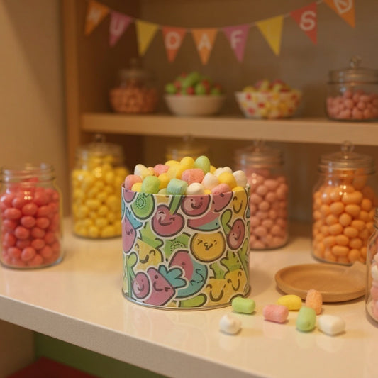 Lata com estampa de frutinhas perfeita para todas as ocasiões! Com suas cores ela traz diversão e alegria para qualquer momento.