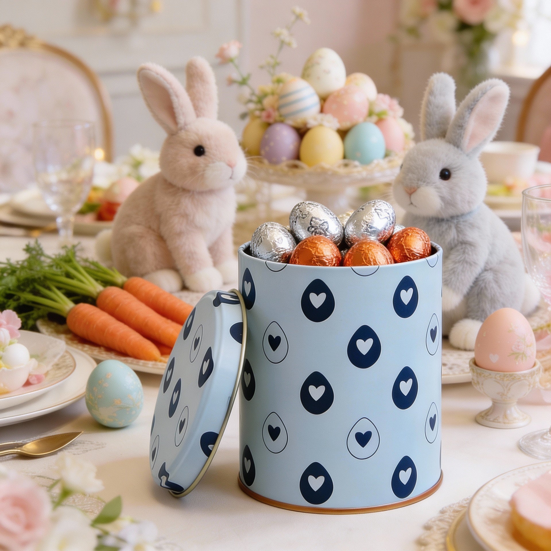 Exclusiva lata corações p e b de edição limitada para celebrar a época mais doce do ano: a Páscoa. Com acabamento luxuoso, é perfeita para presentear com bom gosto e estilo. Adicione um toque sofisticado à sua celebração com esta lata de design refinado.