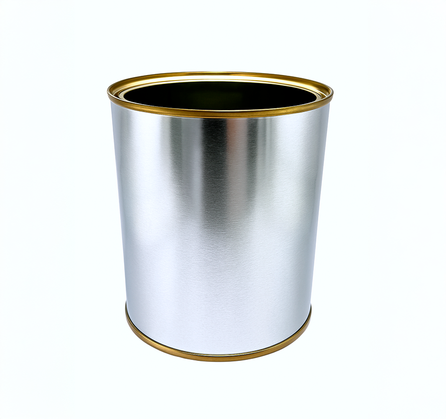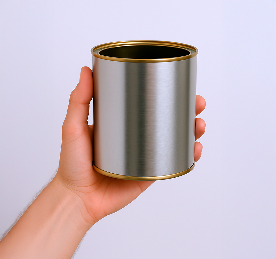 Lata na cor prata, com diâmetro de 9,9cm e altura de 12,2 cm